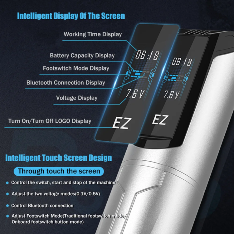 پن شارژی P5TS یکی از جدیدترین دستگاههای بیسیم حرفهای در دنیای تاتو است که با طراحی زیبا، عملکرد قوی و کنترل دقیق و البته صفحه لمسی تجربهای متفاوت از کار تاتو را برای هنرمندان حرفهای فراهم میکند. این دستگاه با موتور قدرتمند نسل جدید و باتری با دوام بالا طراحی شده تا بتواند در جلسات طولانی، عملکردی نرم، دقیق و بیوقفه ارائه دهد. P5TS مناسب برای اجرای انواع سبکهای تاتو از جمله لاین، شید و فیلینگ است و با کارتریجهای استاندارد تاتو کاملاً سازگار میباشد