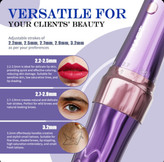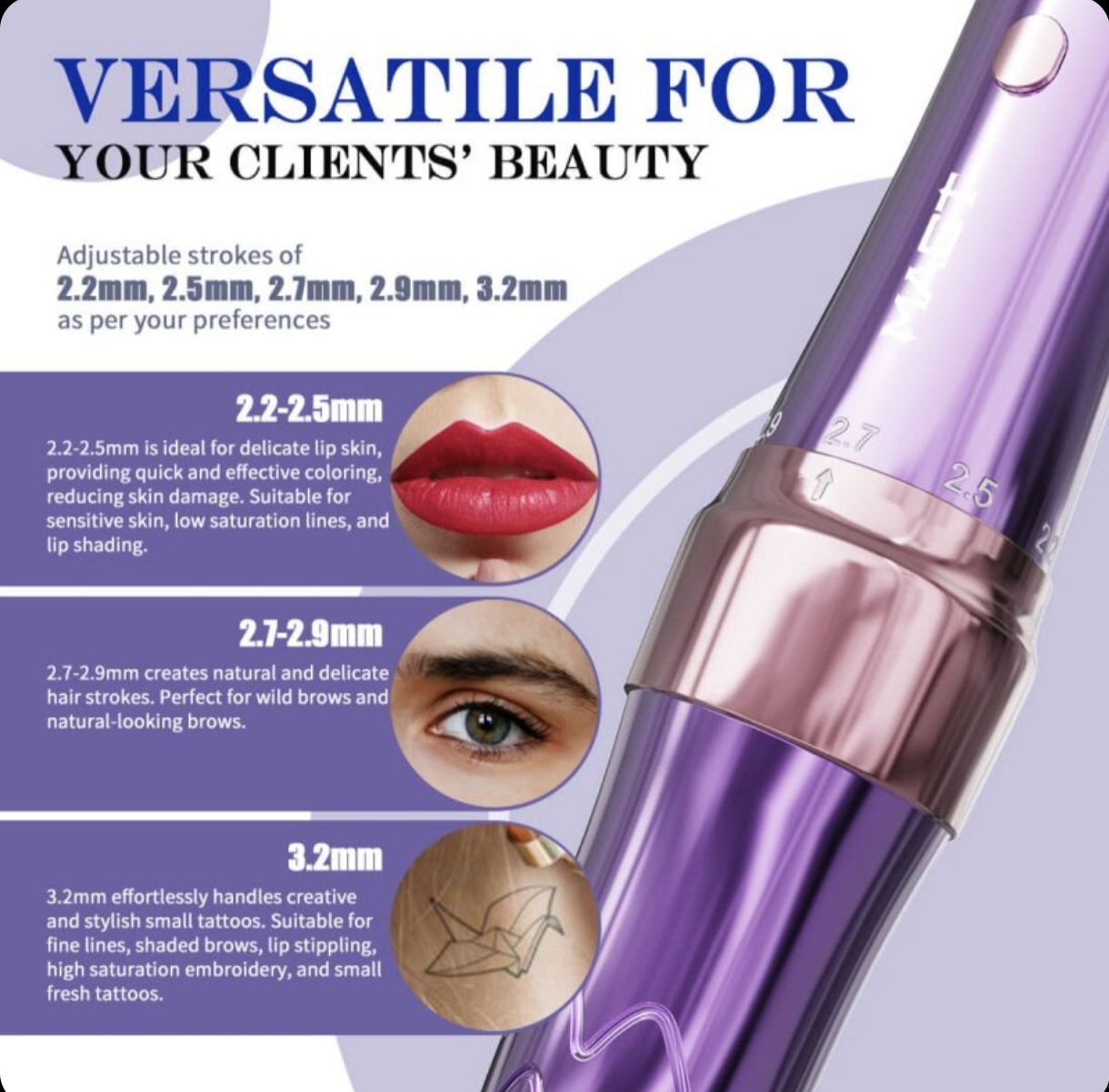 میزان ضربهی قابل تنظیم: طول ضربهی متغیر در ۵ سطح ۲.۲ / ۲.۵ / ۲.۷ / ۲.۹ / ۳.۲ میلیمتر برای کاربردهای متنوع PMU؛ از لبهای ظریف تا ابروهای طبیعی و تاتوهای کوچک.